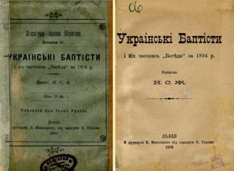 Cover and title page of a separate print of Lesja Ukrainka’s article "Ukrainian Baptists and their magazine "Conversation" in 1894." (Lviv: 1895) |