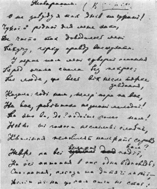 First page of autograph Lesja Ukrainka's rhyme "To friends" After publication: Lesja Ukrainka. – K.: Soviet school, 1979, p. 82. |