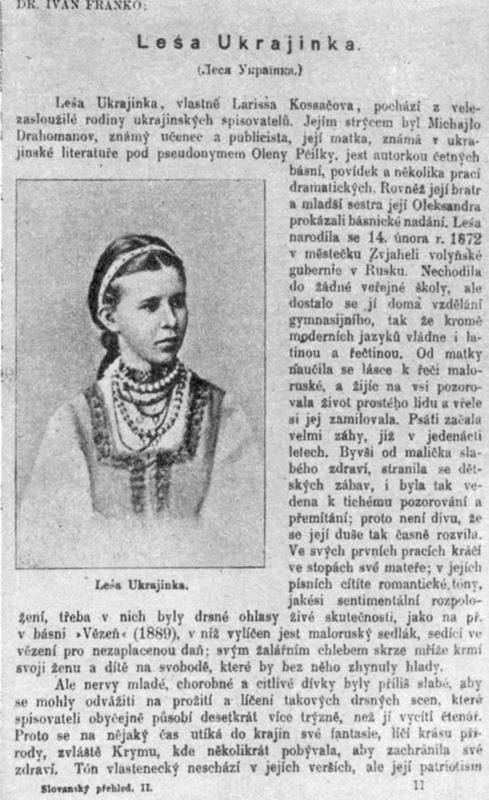 Page of magazine «Slovanský přehled» (1900, Roć. 2. – № 4. – S. 161 – 162) with the publication of the article "Lesja Ukrainka" by I. Franko