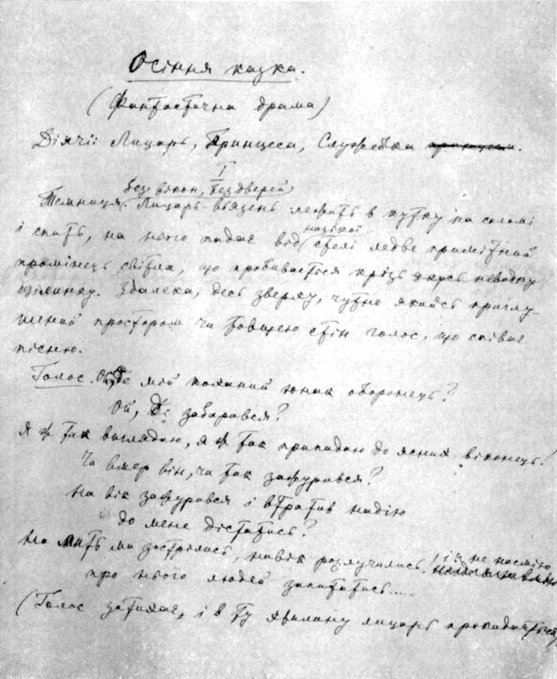Autumn tale. First page of autograph, 1905Fantastic drama "Autumn tale". First page of autograph (1905) After publication: Lesja Ukrainka. Collected works in 12 vols. – K.: Naukova Dumka, 1976, v. 3, p. 17. Additional photos |