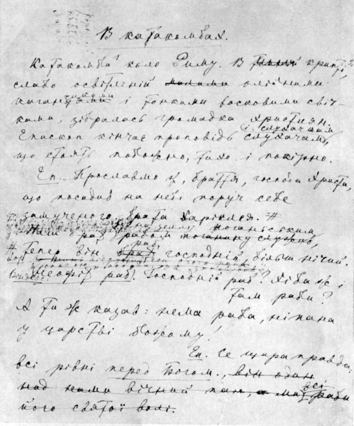 In the catacombs. First page of autograph, 1905The dramatic poem "In the catacombs". First page of autograph (1905) After publication: Lesja Ukrainka. Collected works in 12 vols. – K.: Naukova Dumka, 1976, v. 3, p. 49. Additional photos |