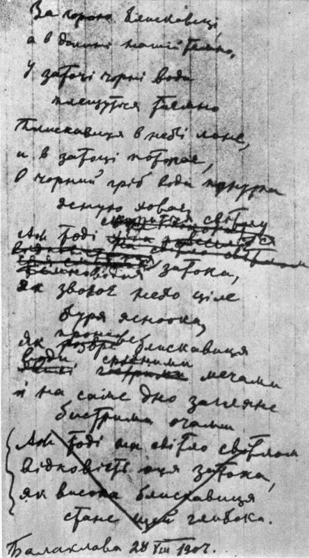 Autograph of Lesja Ukrainka's rhyme "Behind mountain lightning…" After publication: Lesja Ukrainka. – K.: Soviet school, 1979, p. 167. |